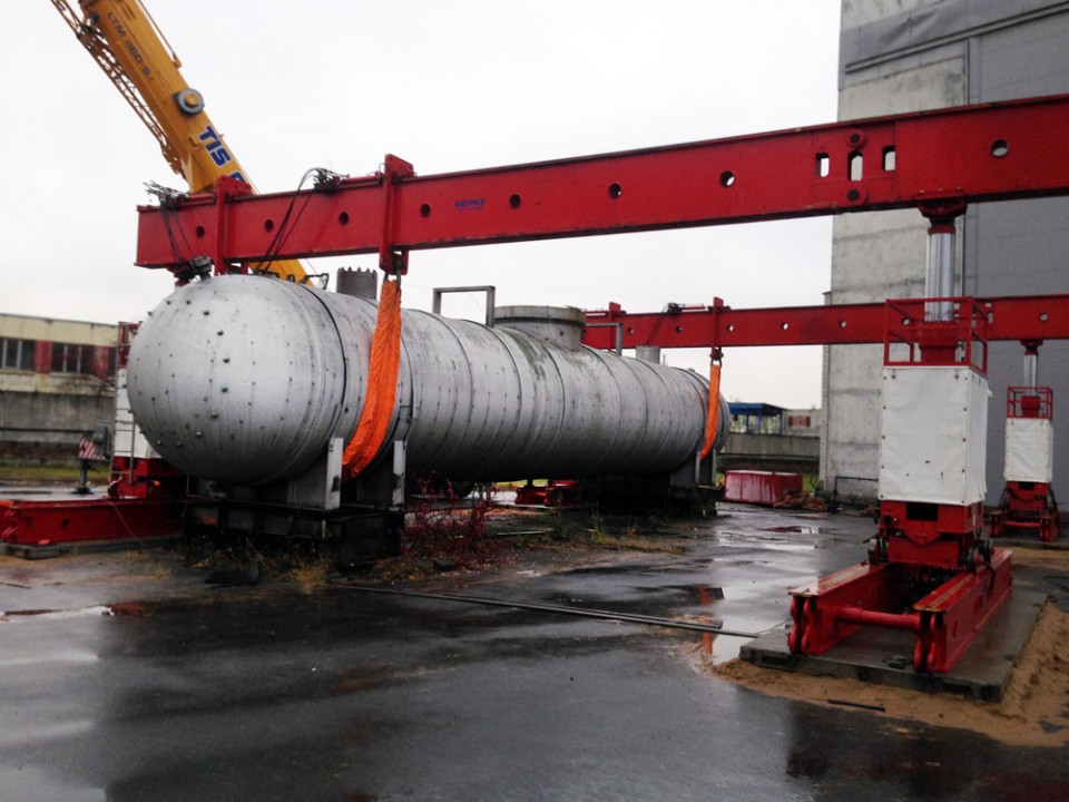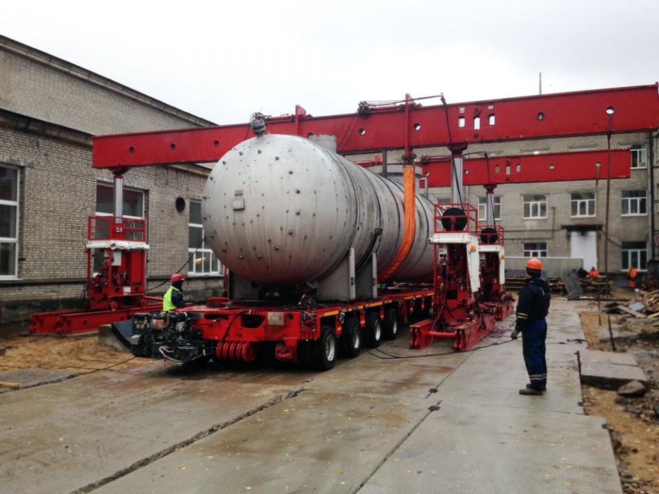 Комплекс работ включил в себя три стадии: погрузку на транспортное средство с использованием гидравлической портальной системы Greiner г/п 320 тонн, последующую транспортировку и выгрузку.